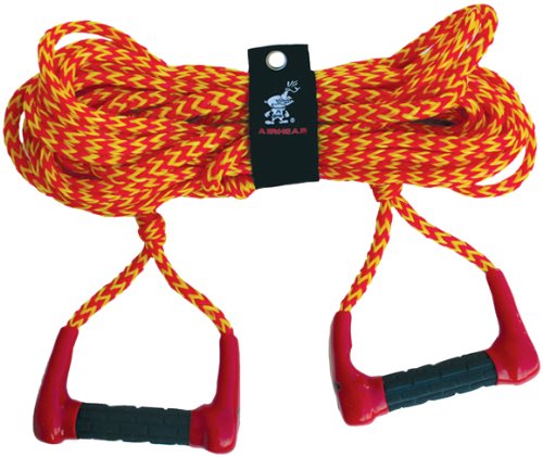 AIRHEAD® Double Handle Ski Rope - Double handle ski ropes have been popular for learning how to slalom for decades. Some experienced skiers also enjoy a double handle pull. This is the highest quality double handle ski rope ever made. The TPR tractor grip and 4” finger guards provide a comfortable and precise hold. You can’t miss the rope during deep water starts with this bright yellow and red color scheme. 75 feet long, 1 section.